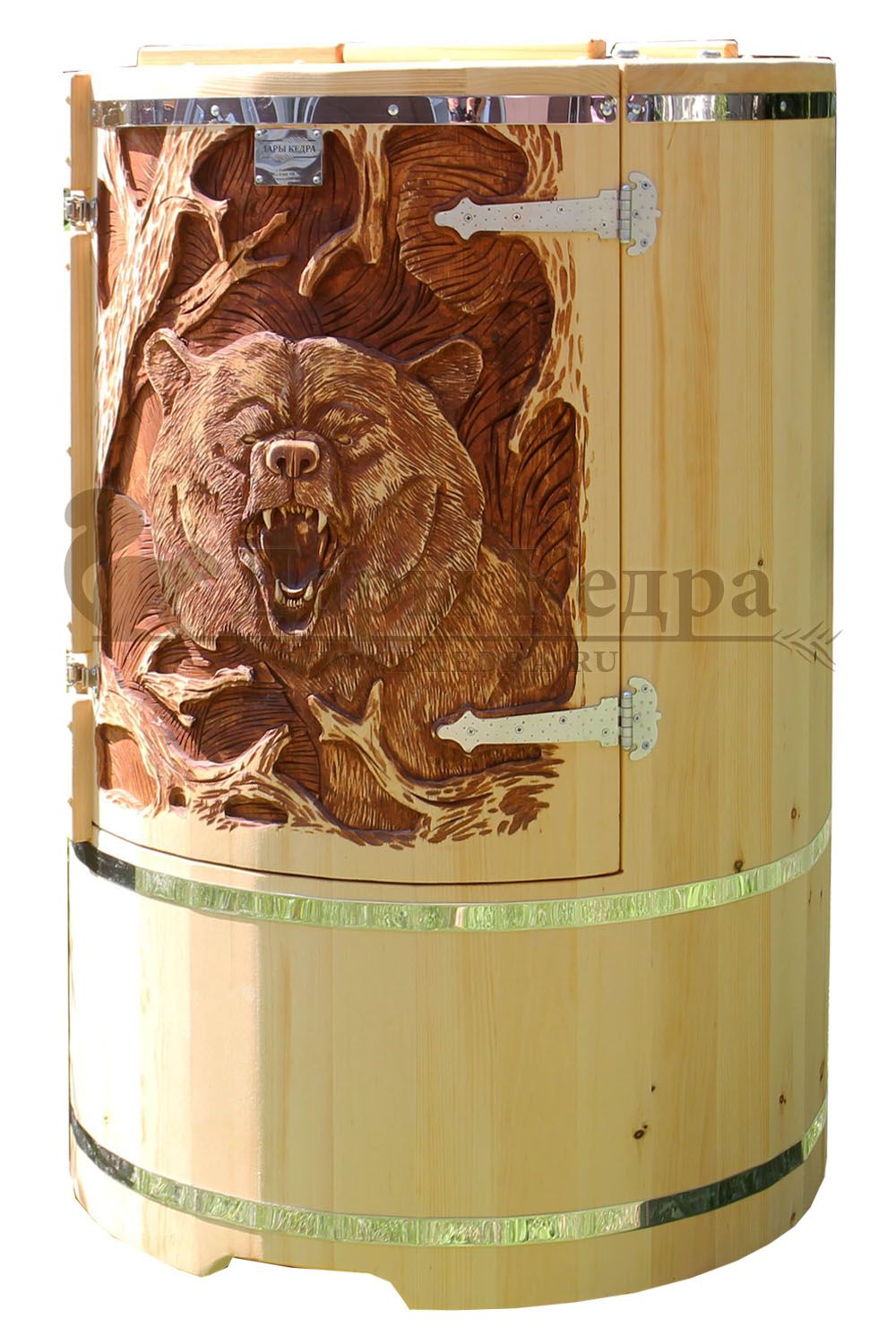 Кедровая бочка (фитобочка) «Олимпийский чемпион» Это эксклюзивная фитобочка любой модели и комплектации с резьбой вашего логотипа или фирменного знака. Просто приготовьте эскиз рисунка, и наши мастера перенесут его на изделие. Авторский рисунок на фитобочек придаст оригинальность вашему дому или салону красоты, подчеркнёт вашу индивидуальность и непревзойденный вкус. Художественная резьба это ручная работа, выполняется разными мастерами и каждый рисунок неповторим. Вы можете выбрать предложенные варианты резьбы или подобрать изображение и мы предложим вам подходящий эскиз. На сайте представлены наши работы в качестве примера. Каждая резьба рассчитывается индивидуально и может быть нанесена на любую модель фитобочки. Парение в фитобочке благотворно влияет на организм в целом: повышается иммунитет, выводятся шлаки и токсины, улучшается работа органов тела и состояние кожи. Обязательно обращайте внимание на размер дверных проемов вашего помещения. Если они меньше 78 см, то закажите разборную модель!