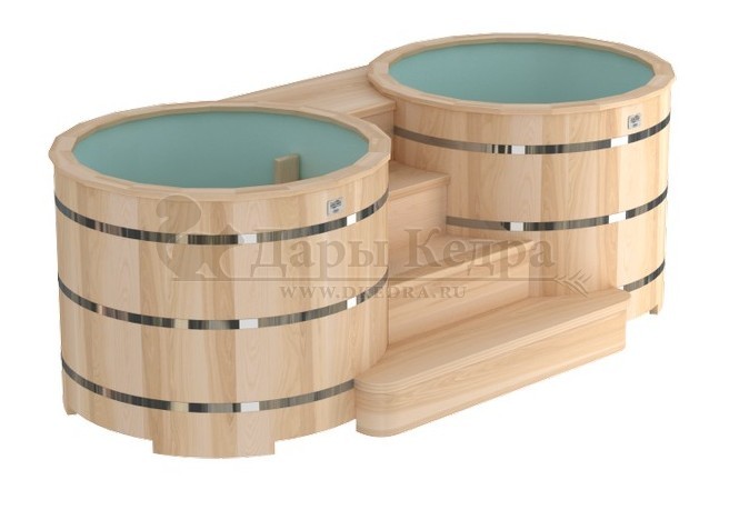 Купель двойная овальная гладкая столярная из кедра с пластиковой вставкой Купель представляет собой две овальные емкости для воды с пластиковыми вставками, в которых люди отдыхают после парения. Между купелями установлен широкий подиум из кедра, по которому могут спускаться и подниматься сразу несколько человек. Для комфортного отдыха купель оснащена лавочками и двумя внутренними лестницами. Двойная купель из кедра с пластиковой вставкой чаще всего используется в крупных банных комплексах и оздоровительных центрах. Внутренняя чаша облегчает уход за изделием и увеличивает срок службы купели.