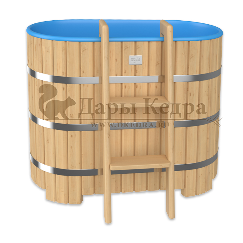 Бондарная овальная купель из кедра с пластиковой вставкой Особенность этой модели заключается в сборке купели по технологии лунный-паз. Паз (углубление) одной доски прочно соединяется с выемкой следующей. Такая сборка осуществляется без клея и гвоздей. Готовая конструкция прочно фиксируется нержавеющими обручами. Пластиковая вставка придает изделию красивый внешний вид, увеличивает срок службы и облегчает уход за купелью. Для удобства пользования купель оснащена лавочками, приставной и внутренней лестницей из кедра. Подходит для комнатного и уличного использования. Купели с пластиковой вставкой рекомендуется заказывать для непрерывного использования в банных комплексах или оздоровительных центрах. Внутренняя чаша облегчает уход за изделием и увеличивает срок службы купели.