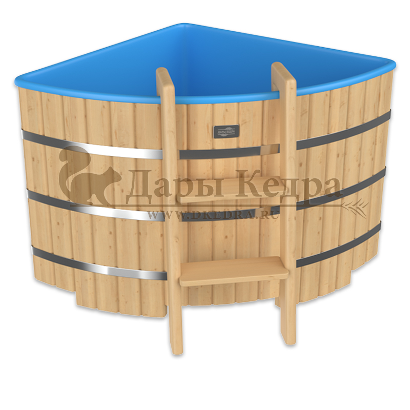 Бондарная угловая купель из кедра с пластиковой вставкой Особенность этой модели заключается в сборке купели по технологии лунный-паз. Паз (углубление) одной доски прочно соединяется с выемкой следующей. Такая сборка осуществляется без клея и гвоздей. Готовая конструкция прочно фиксируется нержавеющими обручами. Пластиковая вставка придает изделию красивый внешний вид, увеличивает срок службы и облегчает уход за купелью. Для удобства пользования купель оснащена лавочками, приставной и внутренней лестницей из кедра. Подходит для комнатного и уличного использования. Купели с пластиковой вставкой рекомендуется заказывать для непрерывного использования в банных комплексах или оздоровительных центрах. Внутренняя чаша облегчает уход за изделием и увеличивает срок службы купели.
